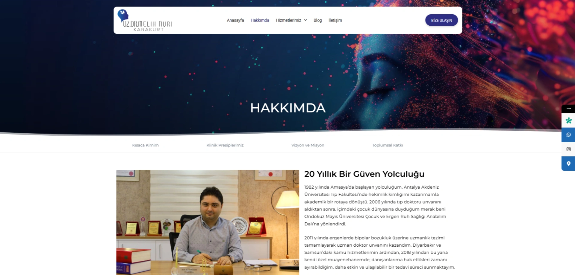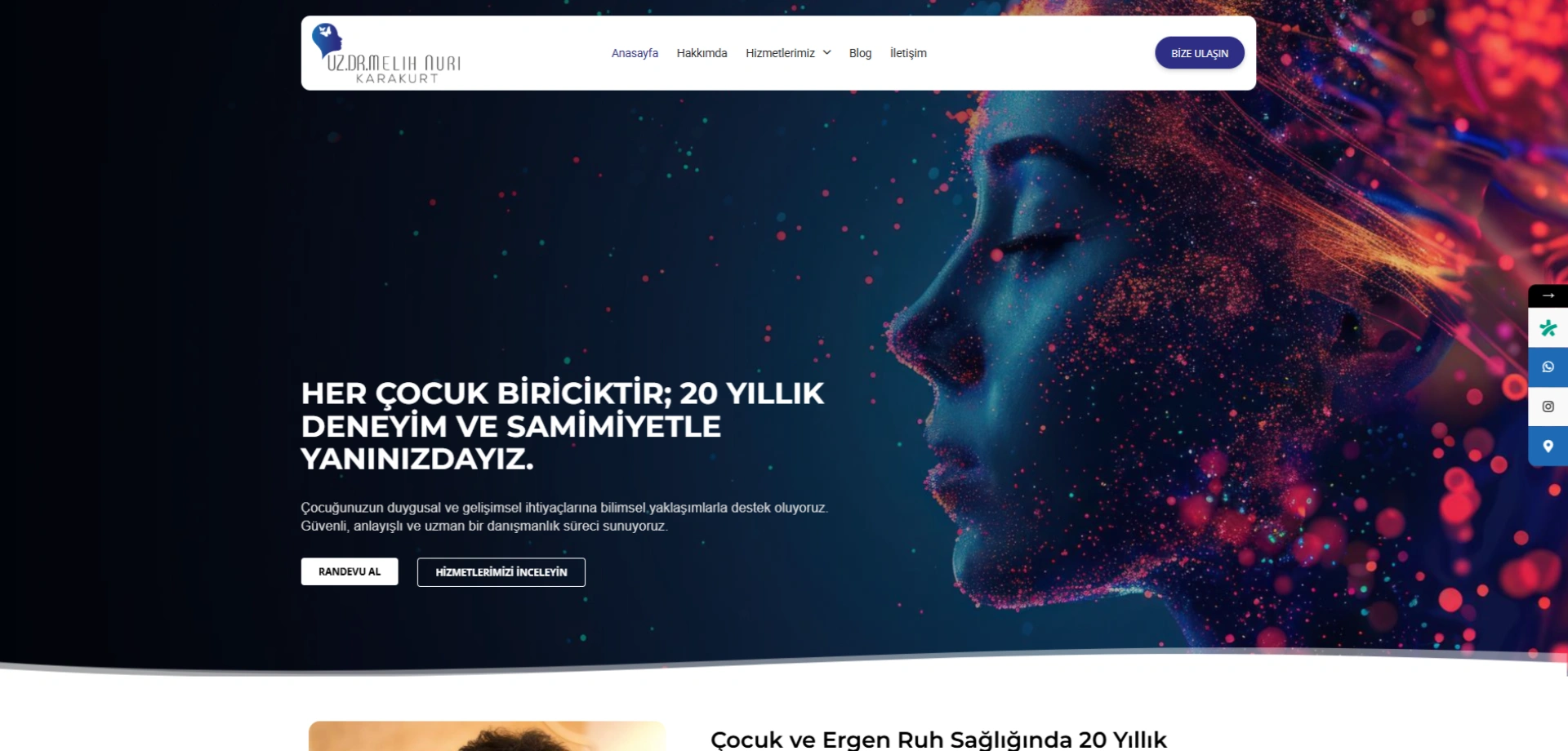 Proje Özeti: Çocuk ve ergen psikiyatrisi alanında 20 yıllık köklü bir deneyimi, modern nöroteknolojik yaklaşımlar ve bütüncül tıp anlayışıyla buluşturan kurumsal bir web sitesi çalışmasıdır. "Her çocuk biriciktir" felsefesini dijital dünyaya yansıtan tasarım; güven veren, samimi ve erişilebilir bir kullanıcı deneyimi (UX) sunmaktadır. Bilimsel içeriklerin ön plana çıkarıldığı, SEO uyumlu ve hızlı çalışan, klinik otoritesini pekiştiren modern bir dijital kimlik projesidir.